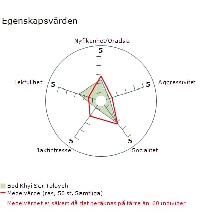 * Nyfikenhet/Orädsla 2,4 * Aggressivitet 1,0 * Socialitet 3,0 * Jaktintresse 1,0 * Lekfullhet 2,6 *